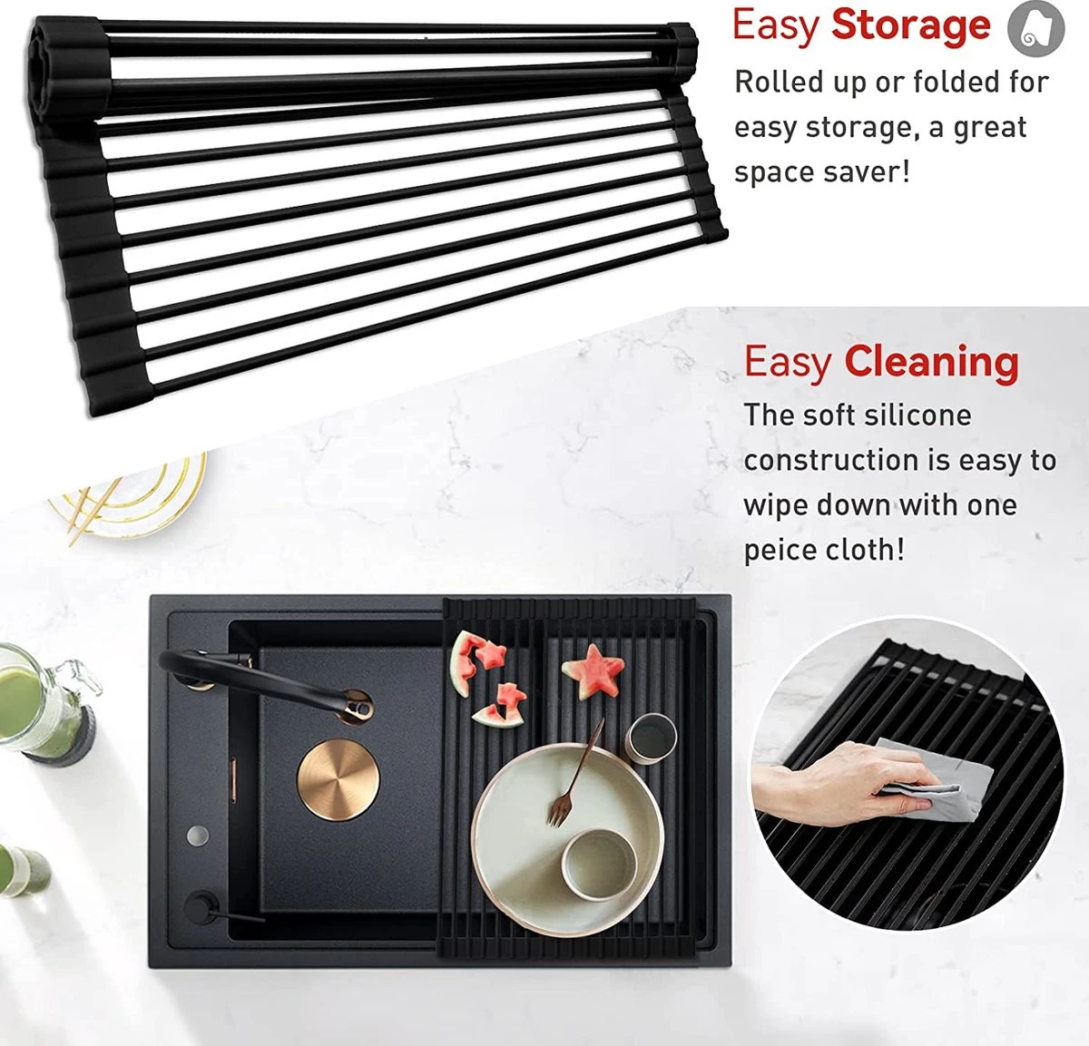All-In-One Over The Sink Drying Rack: Multifunctioneel keukenmateriaal – schotel droogrek, onderzetter, warmte-isolatiemat, vergiet, voorbereidingsruimte, afvoer van overbewaterde bloempotten – alles in één! Dit opklapbare afdruiprek kan niet alleen worden gebruikt als afdruiprek voor het aan de lucht drogen van keukengerei, zoals afgewassen kommen, pannen, glazen, kopjes, platen, kookgerei, bestek, steelpan, mokken; maar ook als een groente vergiet voor het wassen van fruit en groenten met oprolbaar afdruiprek boven de gootsteen keuken.