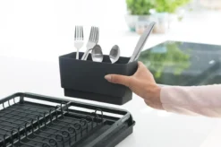 Afgeknapt op je afwas? Het Brabantia Sink Side Afdruiprek – Dark Grey geeft aandacht aan je aanrecht. Dit mooie afdruiprek biedt volop ruimte aan borden, pannen, glaswerk en bestek. De siliconen mat vangt het overtollige water op en houdt je aanrecht droog en kan ook los worden gebruikt. Met het uitneembare bestekbakje vul je in een handomdraai je besteklade.