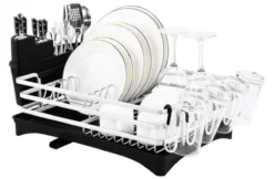 Rekcapaciteit: de bestekhouder biedt plaats aan 9 borden, meerdere kommen en tientallen vorken en messen, aan de zijkant bevinden zich 4 bekerhouders.