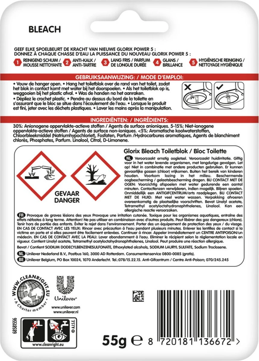 Het Glorix Bleek WC blok geeft elke spoelbeurt de kracht van Glorix Power 5, tot wel 300 spoelbeurten lang. Het product heeft diverse voordelen! Het reinigend schuim met anti-kalk werking houdt je toilet lang fris en zorgt bovendien voor glans en een hygiënische reiniging. Zo geniet jij dagelijks van een schoon toilet. De hanger is bovendien 100% recyclebaar!