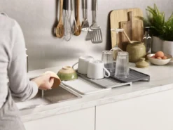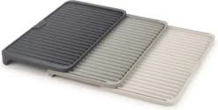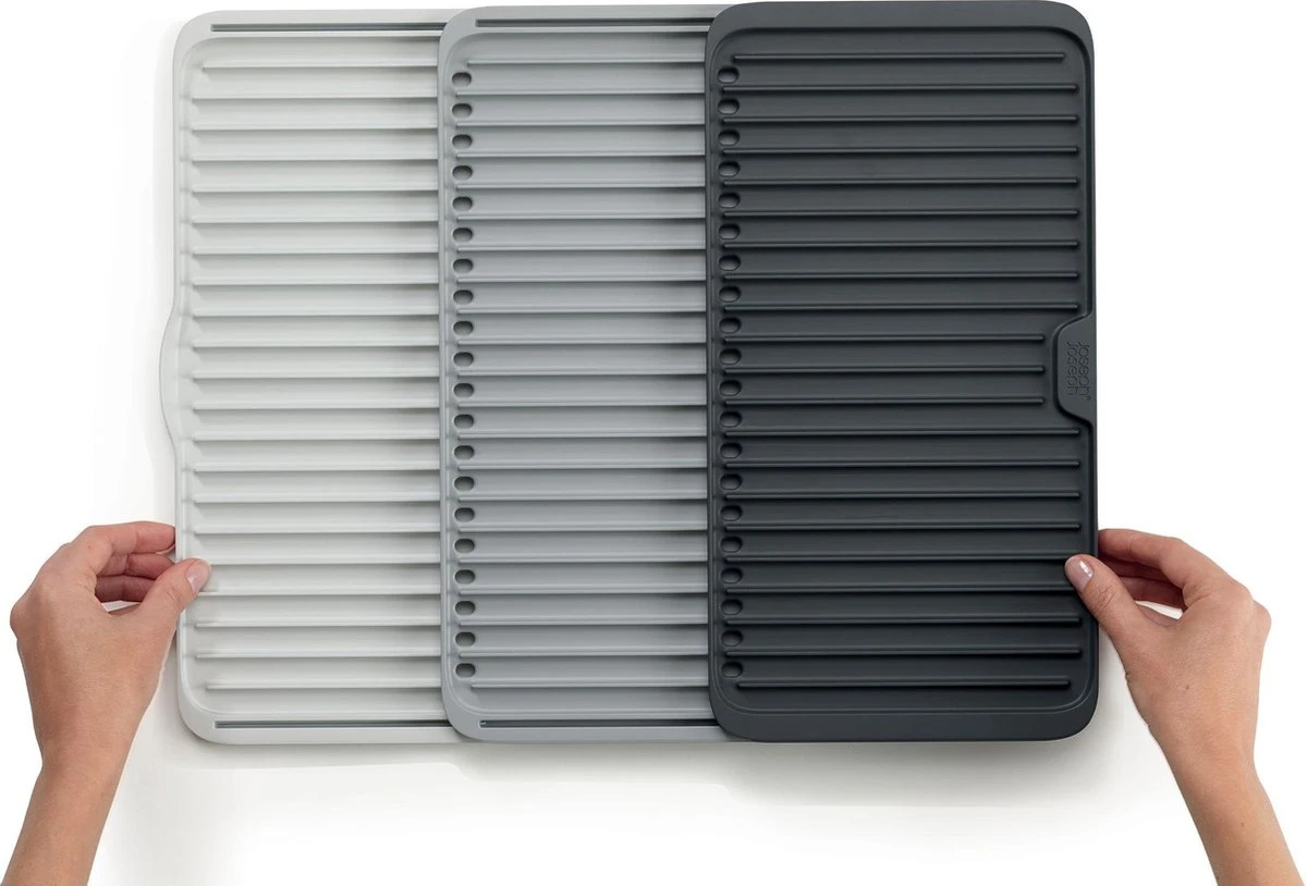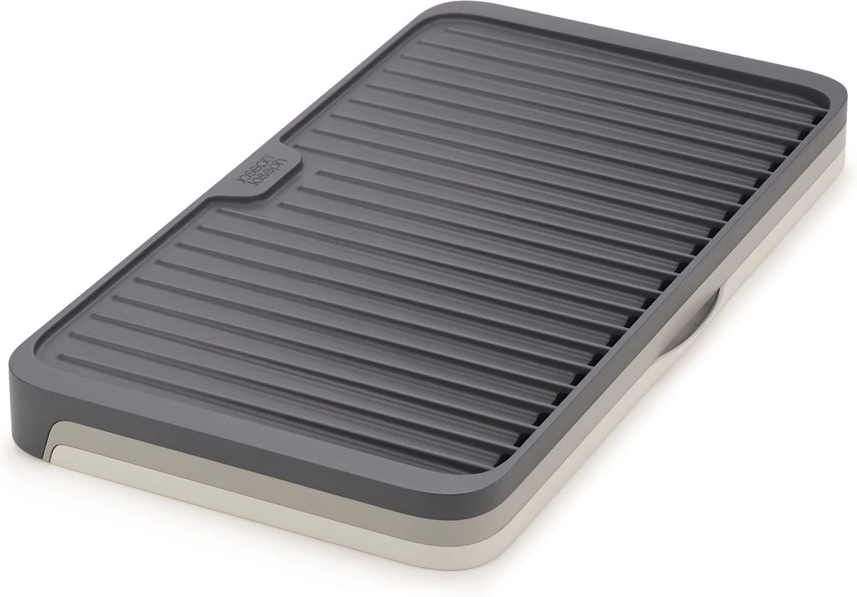 Met de Tier uitschuifbare afdruipmat van Joseph Joseph ben je voortaan verlost van een waterballet op het aanrecht. De mat is uitschuifbaar in 3 delen wat ervoor zorgt dat je genoeg ruimte hebt voor het laten uitlekken van kopjes, glazen en kommen. De mat is voorzien van een eveneens uitschuifbaar afvoergootje waardoor het overtollige water rechtstreeks in de gootsteen gegooid kan worden. De geïntegreerde ribbels zorgen ervoor dat er geen water achterblijft in de kopjes, glazen en kommen. Na gebruik kan de afdruipmat weer worden ingeklapt voor ruimtebesparing.