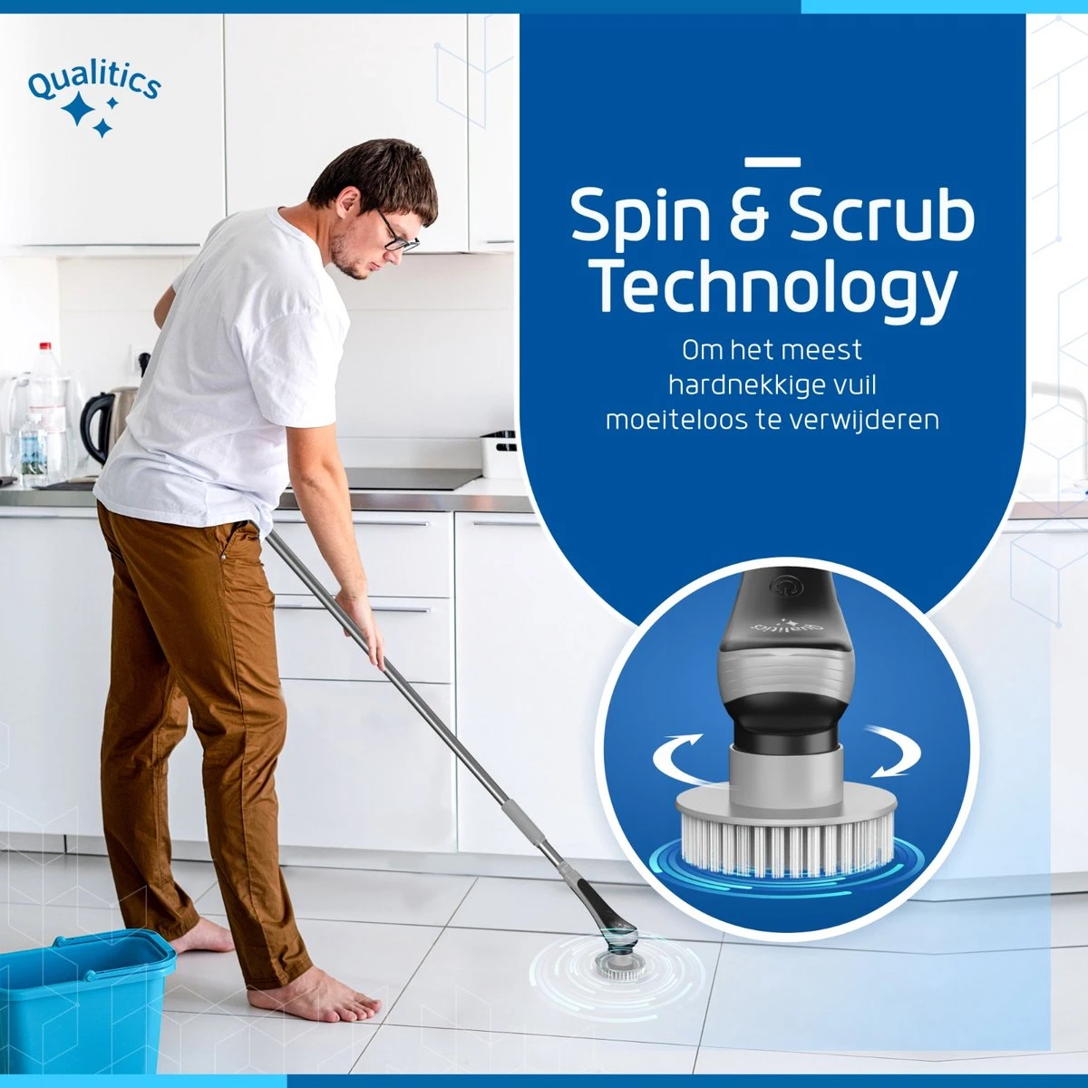 Op zoek naar een snelle, effectieve en klachtenloze manier om grondig schoon te maken? Ontmoet dan nu de vernieuwde elektrische schoonmaakborstel van Qualitics! Dankzij de Spin & Scrub technologie, de 10 verschillende opzetstukjes en de telescopische uitschuifbare stang is deze schoonmaakborstel de multifunctionele oplossing voor alle problemen rondom het huishoudelijk schoonmaken. Het schoonmaken van uw keuken, badkamer, woonkamer en zelfs uw schoenen en auto is hierdoor nog nooit zo makkelijk geweest!