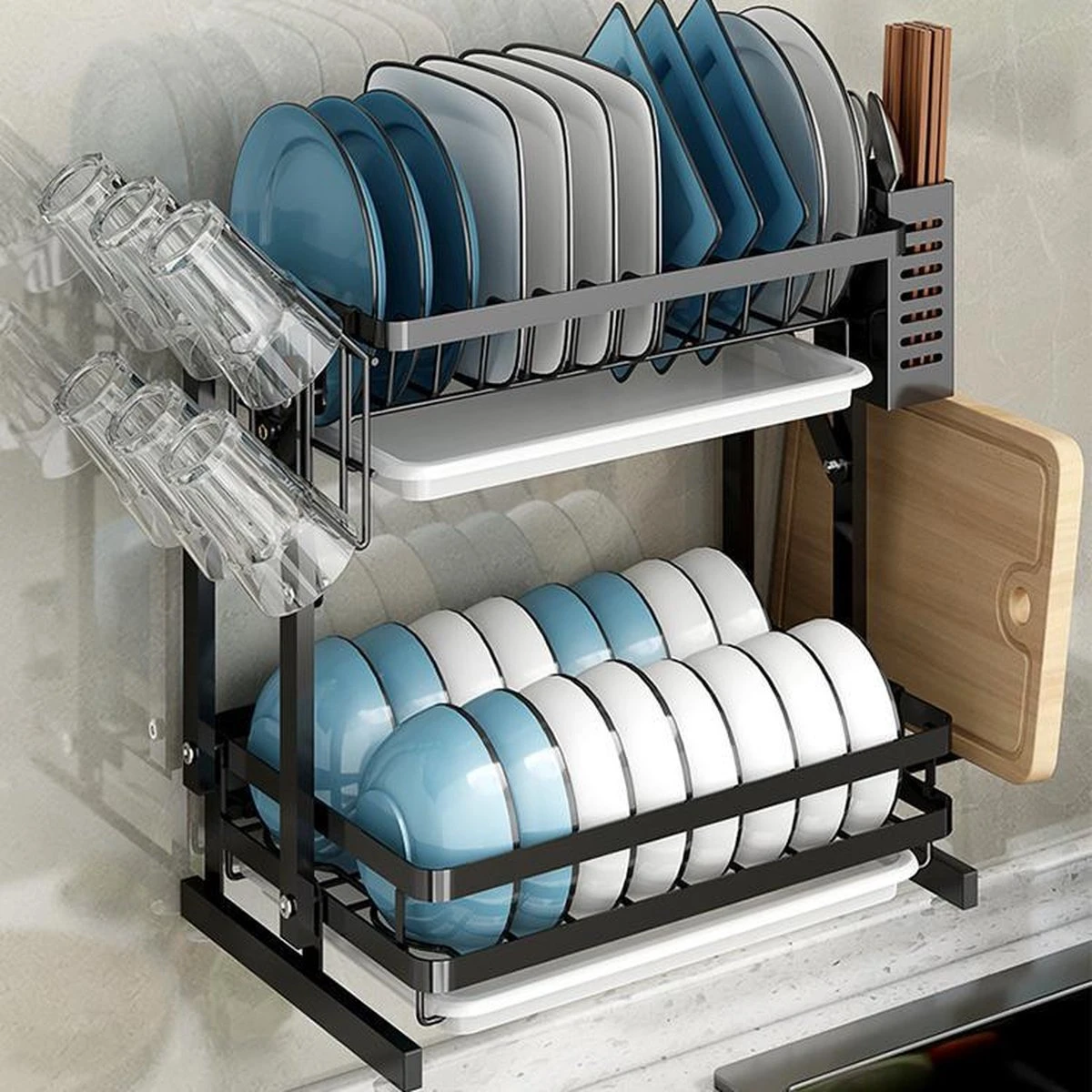 De 2 laags afdruiprek heeft de afmeting van 35×26,5x38CM. Er passen tot 10 borden boven, 16 kommen beneden. Ons afdruiprek wordt geleverd met:
