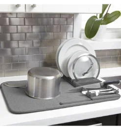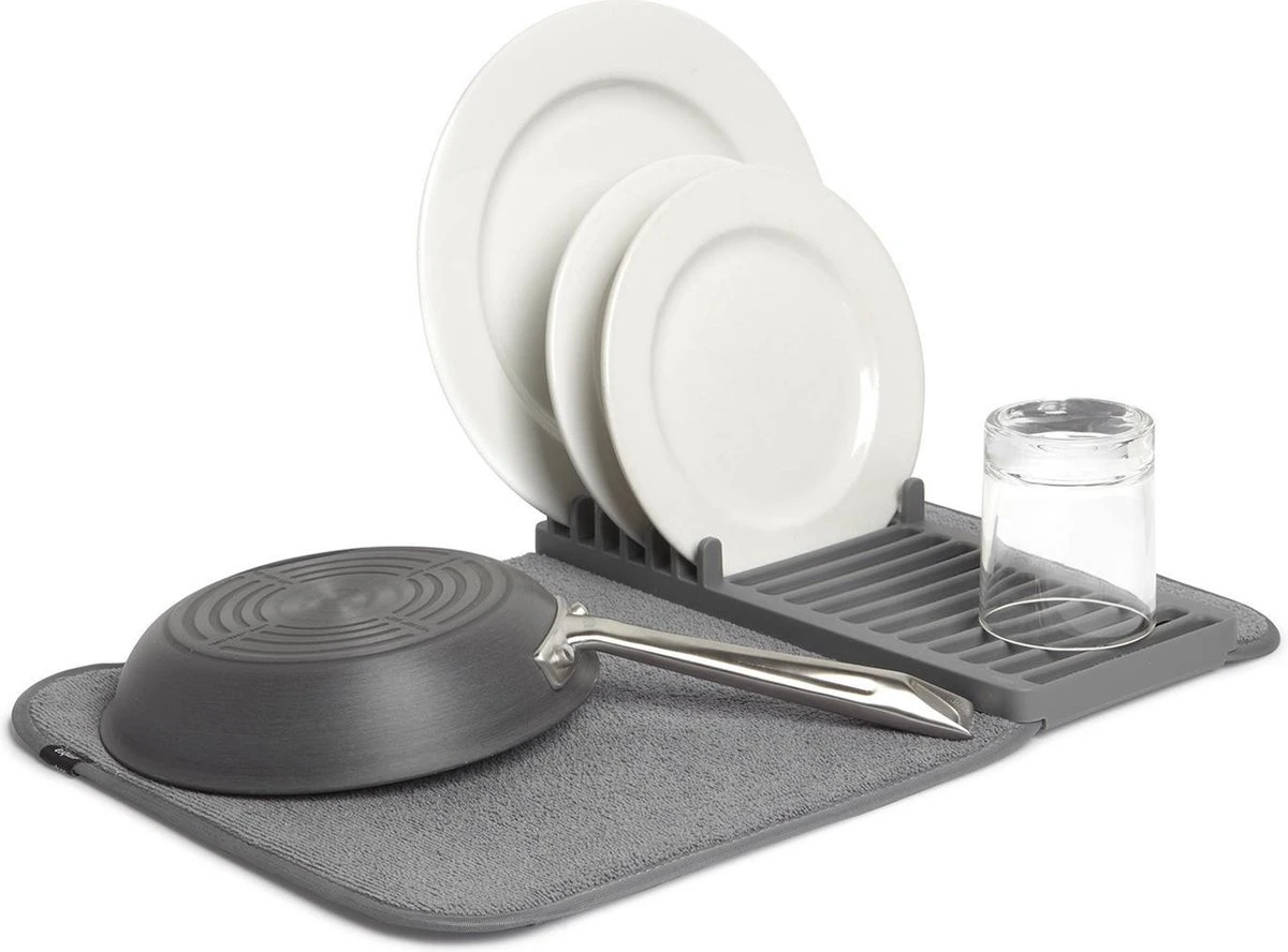 Een handige combinatie tussen een afdruiprek en een vaatdoekje, deze Udry mini van Umbra. Wanneer je een kleine keuken hebt is dit de ideale oplossing. Wanneer je een vaatdoekje gebruikt om de vaat op te zetten is deze vaak heel snel helemaal doorweekt. En een standaard afdruiprek neemt veel ruimte in beslag.