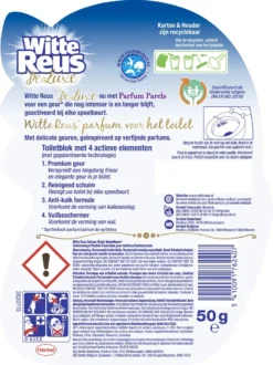 Het Witte Reus De Luxe Magic Moonflower toiletblok zorgt voor een prettige en langdurige geurbeleving van hoogwaardige parfums in elke badkamer. Daarnaast zorgt het toiletblok voor een uitstekende reiniging van het toilet en voorkomt het de vorming van kalkaanslag en vuil.