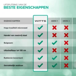 Met de kantelbare en uitschuifbare plumeau van WITTS stoft u elk hoekje van het huis gemakkelijk en snel af. Moeilijk bereikbare plekken zijn geen uitdaging voor de plumeau met kantelbare telescoopsteel. De makkelijk schoon te maken plumeau verwijdert stof binnen een handomdraai, zodat u zonder moeite kan genieten van een schoon huis.